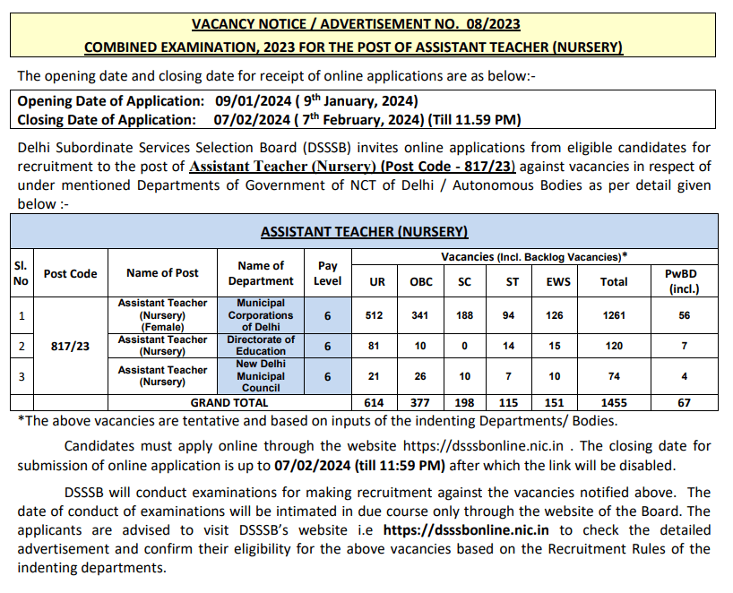 DSSSB Recruitment 2024: दिल्ली में 1455 पदों के लिए बंपर पर भर्ती तुरंत करें आवेदन!