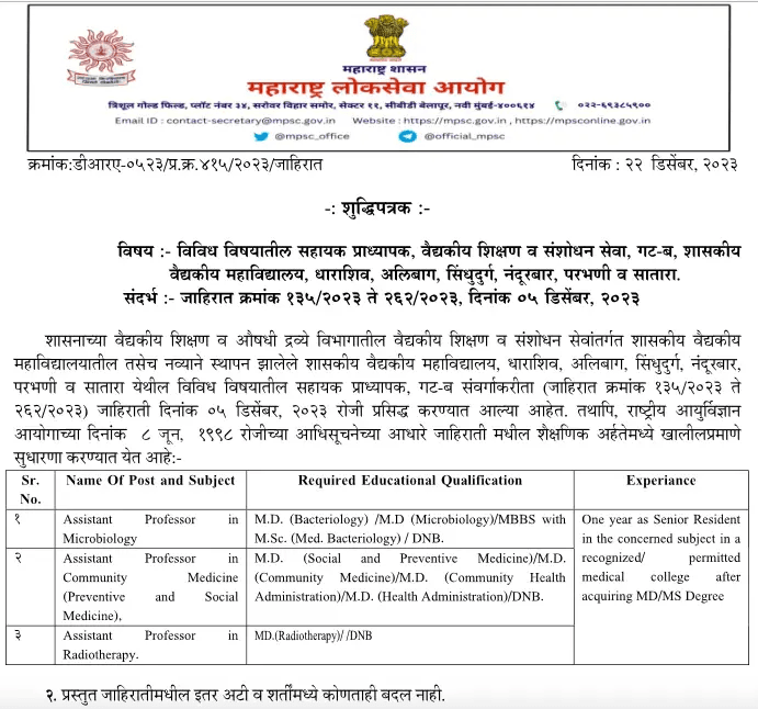 महाराष्ट्र लोकसेवा आयोग ने महाराष्ट्र शिक्षण सेवा ग्रुप ए के तहत प्राचार्य, शासकीय औद्योगिक प्रशिक्षण संस्था या उपप्राचार्य, उपसंचालक, प्राध्यापक, सहयोगी प्राध्यापक और निवासी वैद्यकीय अधिकारी के पदों के लिए भर्ती के लिए अधिसूचना जारी की है|